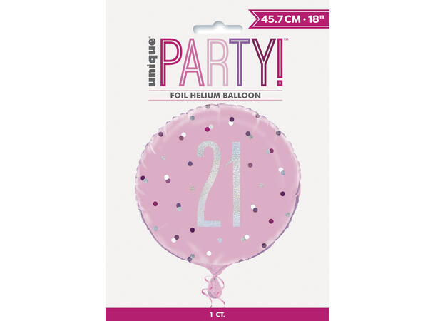 Rosa & Sølv Glitz folieballong med tallet 21 er en strålende måte å markere den store dagen på. Ballongen har et glitrende design i rosa og sølv som gir en festlig og elegant atmosfære, perfekt til å feire 21-årsdagen med stil. Den kan fylles med både helium og luft, og passer like godt alene som i kombinasjon med andre ballonger. En dekorasjon som virkelig setter bursdagsstemningen.