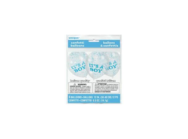 Konfettiballonger med teksten It’s a Boy er en festlig måte å feire den lille prinsen på. De gjennomsiktige ballongene er fylt med blå konfetti som gir en stilig og leken effekt når de blåses opp, og de passer perfekt til babyshower, dåp eller som en del av en gender reveal. Ballongene blir et flott blikkfang alene, i en bukett eller kombinert med andre ballonger i matchende farger. En dekorasjon som garantert sprer glede og stemning blant gjestene. Inneholder 6 stk 30 cm ballonger.