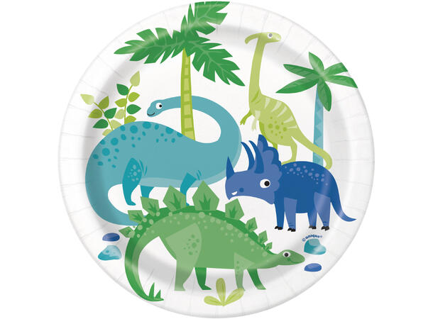 Skap en forhistorisk feststemning med disse dinosaurtallerkenene i papp! Med kule og fargerike dinosaurmotiver blir de en sikker favoritt på barnebursdager eller temafester. Tallerkenene på 18 cm er perfekte til kake, frukt eller små snacks, og gir bordet et lekent og gjennomført preg som små dinosaurfans vil elske. Inneholder 8 stk. Størrelse: 18 cm.