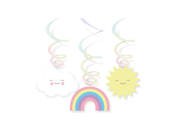 Skap en drømmende og fargerik atmosfære med Rainbow og Cloud hengedekorasjoner! Disse flotte dekorasjonene består av spiraler i glade farger med søte regnbue- og skyfigurer som henger ned, noe som gir en leken og magisk stemning i rommet.De er enkle å henge opp i taket, over festbordet eller ved gavebordet, og gir en nydelig effekt når de beveger seg lett i luften. Perfekte til barnebursdager, dåp, sommerfester eller andre anledninger hvor du vil skape en lys og munter dekor.Pakke med 6 hengedekorasjoner, hver på 61 cm. Matcher perfekt med resten av Rainbow og Cloud-serien for en gjennomført festlook.