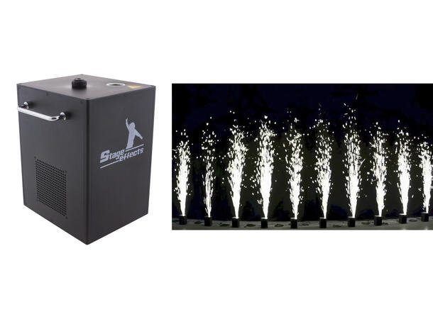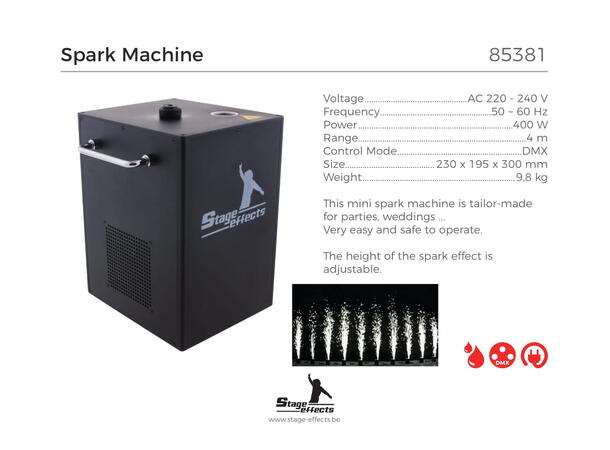 Maskinen kan styres både manuelt og via DMX, slik at du får full kontroll over showet. For å bruke den trengs kompositt (varenummer 75085382), og én pose gir ca. 15 minutter med kontinuerlige gnister.