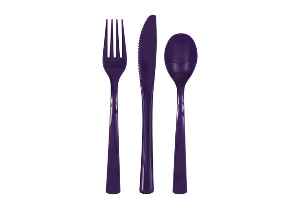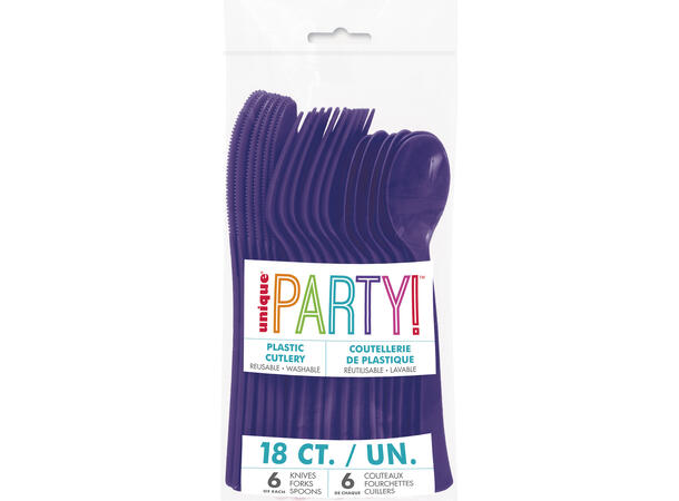 Mørklilla bestikk i plast gir borddekkingen et elegant og unikt preg som skiller seg ut. Den dype lillafargen passer perfekt til temafester, bursdager, konfirmasjoner eller når du vil tilføre en sofistikert touch til feiringen. Bestikket er både praktisk og dekorativt – lett å bruke, samtidig som det er solid nok til å håndtere både kaker og småretter. Kombiner det gjerne med matchende tallerkener og servietter for en helhetlig stil som imponerer gjestene. Inneholder 18 deler (6 kniver, 6 gafler og 6 skjeer).