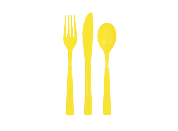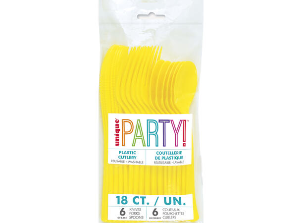 Gult bestikk i plast gir borddekkingen et friskt og livlig preg som passer perfekt til sommerfester, bursdager eller piknik i parken. Den klare gulfargen sprer glede og energi, og er enkel å kombinere med både fargerike tallerkener og festpynt i kontrastfarger. Bestikket er lett og praktisk, men samtidig solid nok til å brukes til både kaker, snacks og småretter. Et enkelt valg som gjør serveringen smidig, samtidig som det setter et lekent uttrykk på feiringen. Inneholder 18 deler (6 kniver, 6 gafler og 6 skjeer).