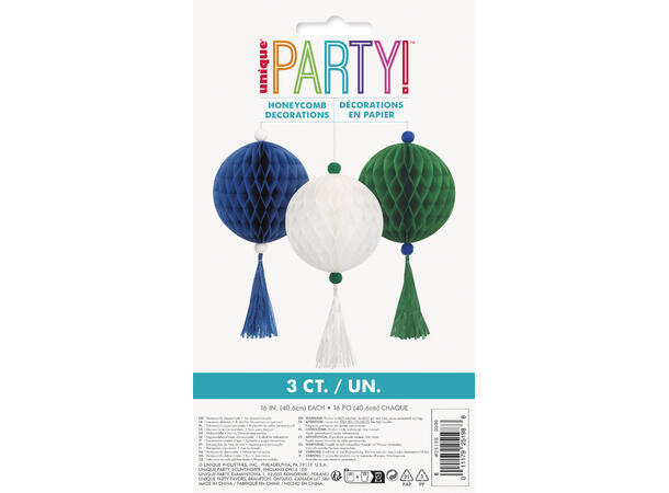Inneholder 3 stk honeycomb ball i papir med tassels.