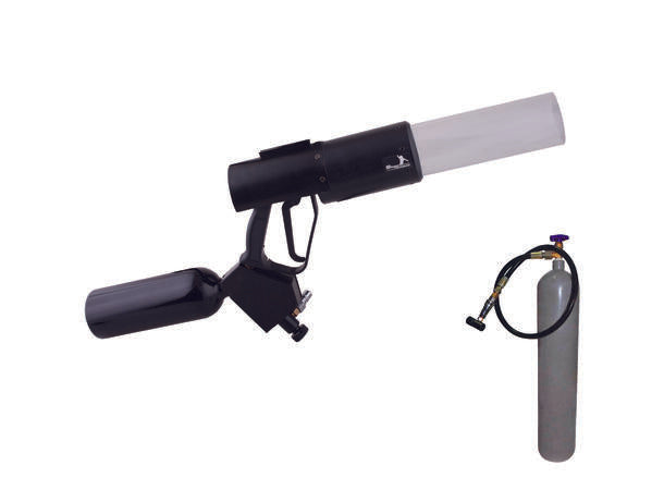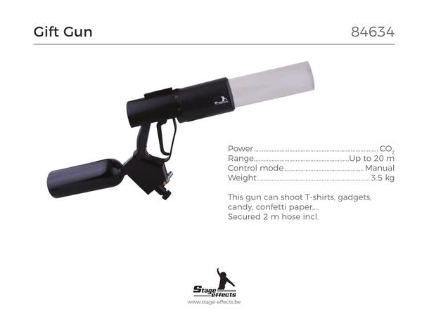 Gavegeværet veier kun 3,5 kg og er enkelt å håndtere. Det kobles til CO2 eller trykkluft, og leveres med en 2 meter sikret CO2-slange. Betjenes med manuell kontroll for full styring over når overraskelsen skal slippes løs.