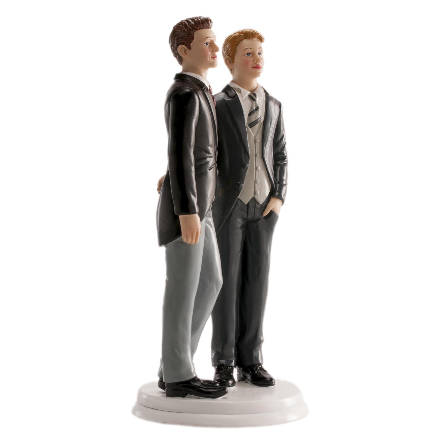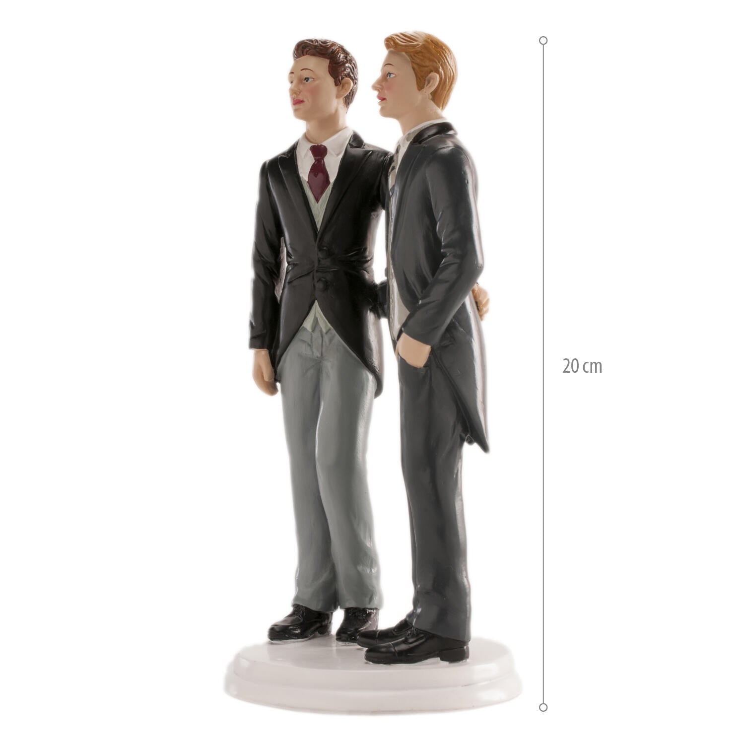 Sett prikken over i-en på bryllupskaken med disse elegante kakefigurene som forestiller et mannlig brudepar. Figuren er laget i slitesterk plast og måler 20 cm, noe som gjør den til et flott og synlig midtpunkt på kaken. Designet er moderne og stilrent, og hyller kjærligheten på en varm og inkluderende måte.