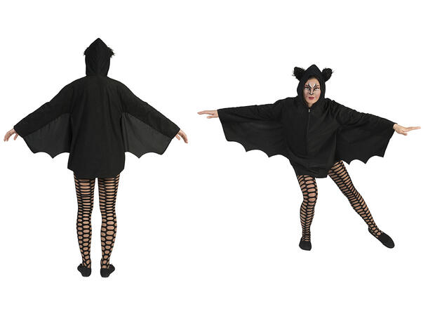 Spre vingene og gjør deg klar for en natt full av moro med dette flaggermus-kostymet for dame! Perfekt til Halloween eller temafester, gir den myke ponchoen med hette et dramatisk og lekent uttrykk som både er komfortabelt og enkelt å bruke. Det flytende designet gjør at du kan bevege deg fritt, samtidig som hette-detaljen rammer inn ansiktet og skaper en mystisk stemning. Et kreativt og iøynefallende kostyme som gjør det lett å skille seg ut på festen og tilfører både moro og dramatikk til antrekket.