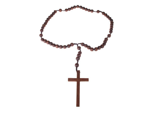 Den naturlige trefinishen gir et rustikt og tidløst preg, og størrelsen gjør den godt synlig enten den henges opp, legges på bordet eller bæres som del av et antrekk. Enten du går for et religiøst tema, en mystisk karakter eller bare ønsker en unik detalj i festdekorasjonen, er denne rosenkransen et allsidig valg.