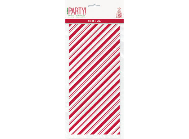 20 praktiske cellofanposer med koselig julemotiv. Posene har design med julenisse og røde striper – perfekt til småkaker, julegodteri eller smågaver. Kommer med lukkere for enkel forsegling. Inneholder: 20 cellofanposer, ink lukkere.Størrelse: 28 x 13 cm.