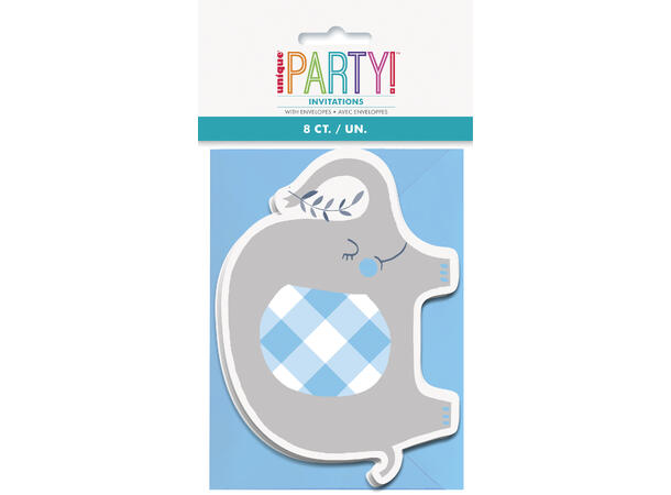Blå elefant invitasjoner i papir er en søt og sjarmerende måte å invitere gjestene til babyshower, dåp eller bursdag. Med sitt koselige elefantmotiv og den rolige blåfargen setter de stemningen allerede før festen starter. Invitasjonene gir et personlig preg og gjør det enkelt å dele all nødvendig informasjon om feiringen. Perfekte for å skape forventning og glede hos gjestene før den store dagen.