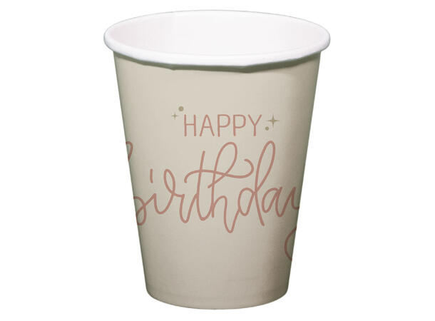 Feir dagen med stil med disse Crème Rose "Happy Birthday" pappkoppene! Med et elegant design i delikate rosatoner og den festlige teksten «Happy Birthday», blir de en nydelig detalj på bursdagsbordet. Koppene rommer 2,5 dl og passer perfekt til både kalde og varme drikker – en praktisk og dekorativ løsning som setter et sofistikert preg på feiringen.