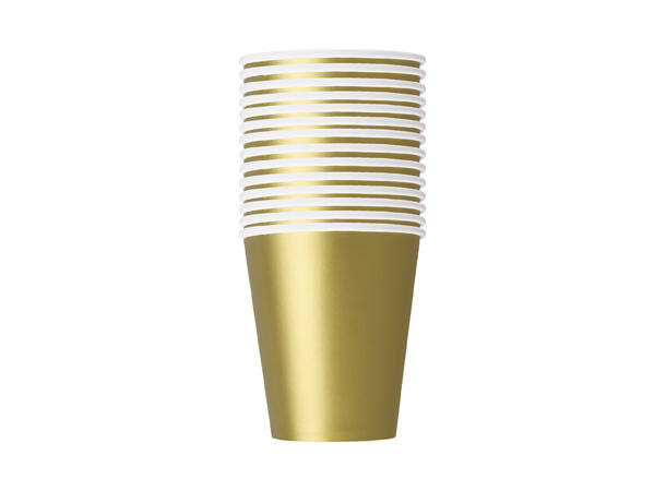 Gi festen et glamorøst preg med disse gullfargede pappkoppene! Den skinnende overflaten gjør dem perfekte til bryllup, nyttår, bursdager eller jubileer, og de tilfører borddekkingen et luksuriøst uttrykk. Koppene rommer 2,5 dl og passer til både kalde og varme drikker – en praktisk og dekorativ detalj som setter prikken over i-en på feiringen.