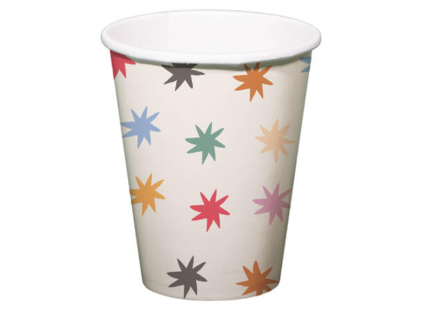 Gjør serveringen både praktisk og stilfull med Star Burst papirkopper. De skinnende stjernedetaljene setter en festlig tone og passer perfekt til alt fra bursdager og nyttår til sommerfester og andre feiringer. Med sin elegante design blir koppene ikke bare en nyttig del av borddekkingen, men også en del av pynten som binder temaet sammen. En enkel og miljøvennlig løsning som gjør festen komplett.Inneholder 8 papirkopper à 2,5 dl.