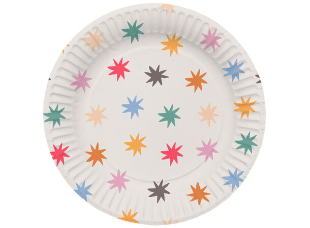 Gi festen et ekstra glitrende preg med disse elegante Star Burst tallerkenene i papir. Med sitt stjernemønster i stilfulle farger passer de perfekt til alt fra bursdager og nyttårsfeiringer til bryllup og jubileum. Tallerkenene er både dekorative og praktiske, og gjør serveringen enkel samtidig som de bidrar til en festlig atmosfære. Enten du serverer småretter, kaker eller snacks, vil disse tallerkenene være et blikkfang på bordet.Inneholder 8 tallerkener i papir – 23 cm.