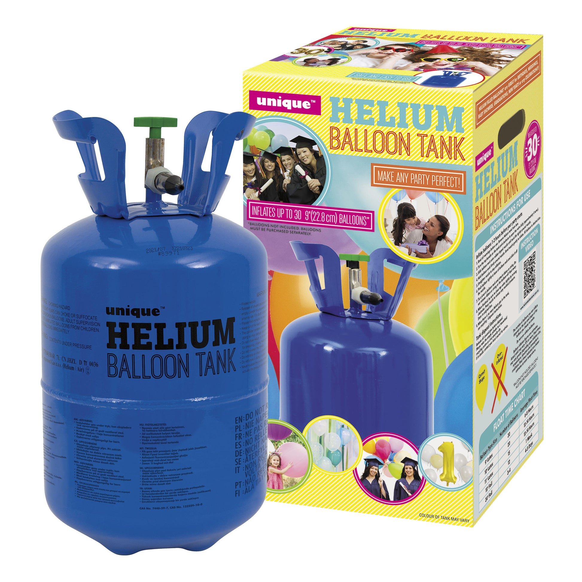 En heliumtank gjør det enkelt å fylle ballonger og skape den magiske svevende effekten som setter prikken over i-en på festen. Denne tanken rommer ca. 150 liter helium og rekker til omtrent 30 ballonger i størrelsen 23 cm. Perfekt til bursdager, dåp, bryllup eller andre feiringer hvor ballonger er en viktig del av dekorasjonen. Tanken er lett å bruke og gir deg muligheten til å fylle ballongene selv hjemme, slik at du sparer tid og får akkurat den mengden du trenger. Inneholder 1 heliumtank (ca. 150 l). Inneholder heliumgass under trykk, kan eksplodere ved oppvarming eller åpen ild. Heliumtanken kan ikke fraktes på fly. Dette er ikke et leketøy, håndtering av heliumtank må skje av personer over 14 år under oppsyn av en voksen. Det er livsfarlig å puste inn heliumgass da oksygenmetningen i blodet synker lynraskt og fører til stor risiko for å miste bevisstheten, dø eller få permanente hjerneskader.