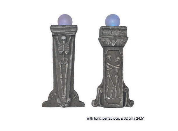 Sett stemningen allerede ved inngangspartiet med disse skjelettstolpene med lys – en perfekt dekorasjon til halloween! Stolpene er 62 cm høye og utformet i plast med hodeskallemotiv som lyser opp når mørket faller. Plasser dem ved inngangen, langs gangveien eller som en del av et større festoppsett for å skape en skummel og innbydende atmosfære. Lyseffekten gir dekorasjonen liv og sørger for at gjestene får en minneverdig velkomst.